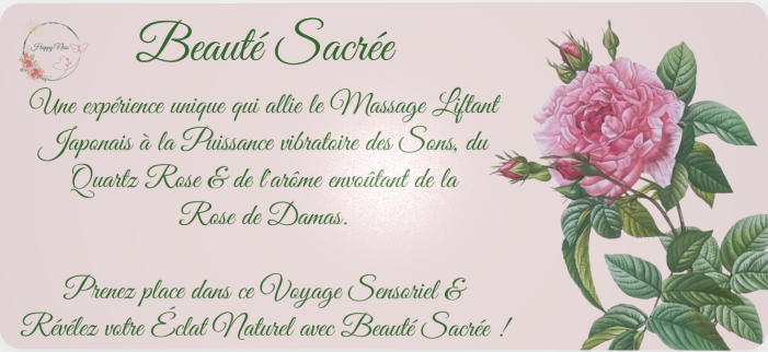Le soin Beauté Sacrée allie la Sonothérapie, le Massage Liftant Japonais, les Serviettes Chaudes, les Bienfaits de la Rose de Damas & du Quartz Rose.